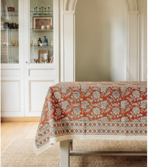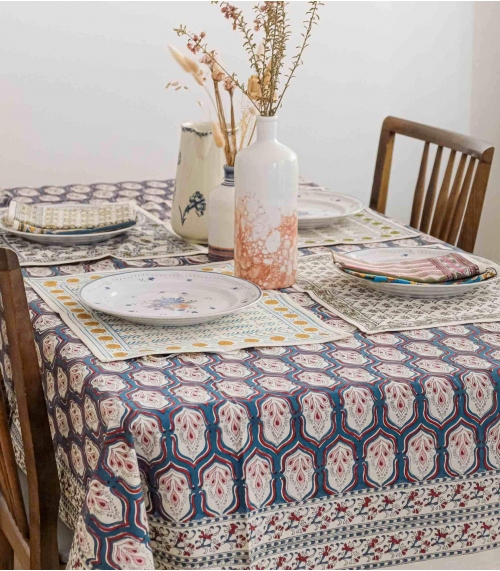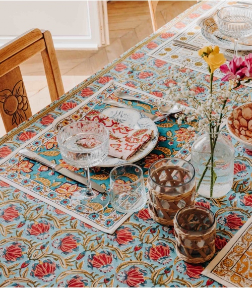 Our Indian tablecloths are printed in our ateliers in India using the technique of "Block print" or wooden stamp, which allows the application of several layers of color on a cotton cloth stretched over a layer of canvas and printed with floral or geometrical patterns.
