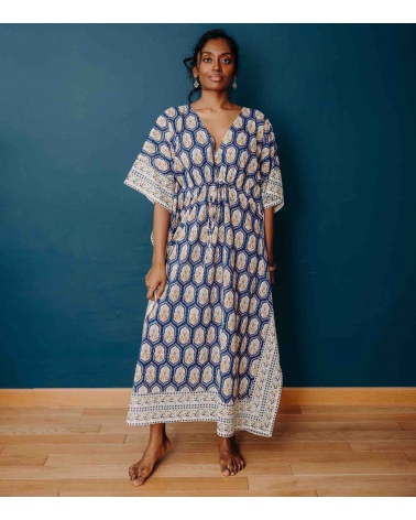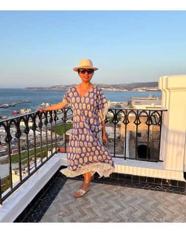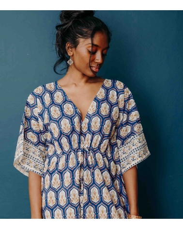 The PRANJAL cotton kaftan comes in two lengths and is adorned with an Art Deco motif. Over a swimsuit, for your summer escapades or evenings out, you'll love its cut, softness and shimmering color!