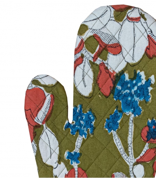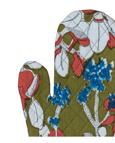 Our new floral glove in olive cotton is designed in Paris and hand block printed in India by expert artisans. Block printing is an ancestral technique from Rajasthan in the West of India. It consists of hand printing fabric using carved wooden blocks. This indian kitchen glove will delight you with its unique aesthetics and irregularities of the fabric that make it even more special.