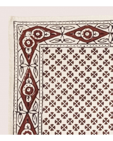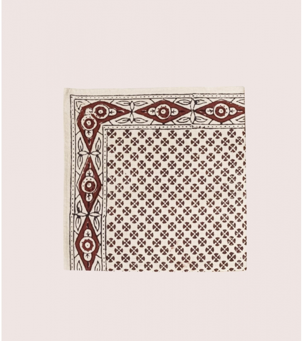 Our square cotton napkin naturally dyed is designed in Paris and hand block printed in India by expert artisans. Block printing is an ancestral technique from Rajasthan in the West of India. It consists of hand printing fabric using carved wooden blocks.