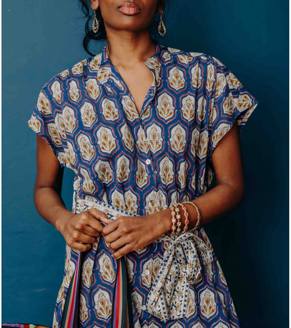 The PRANJAL cotton shirt comes in two lengths and is adorned with a colorful Art Deco-inspired pattern. Over a swimsuit, for your summer escapades or evenings out, you'll love its cut, softness and shimmering color!