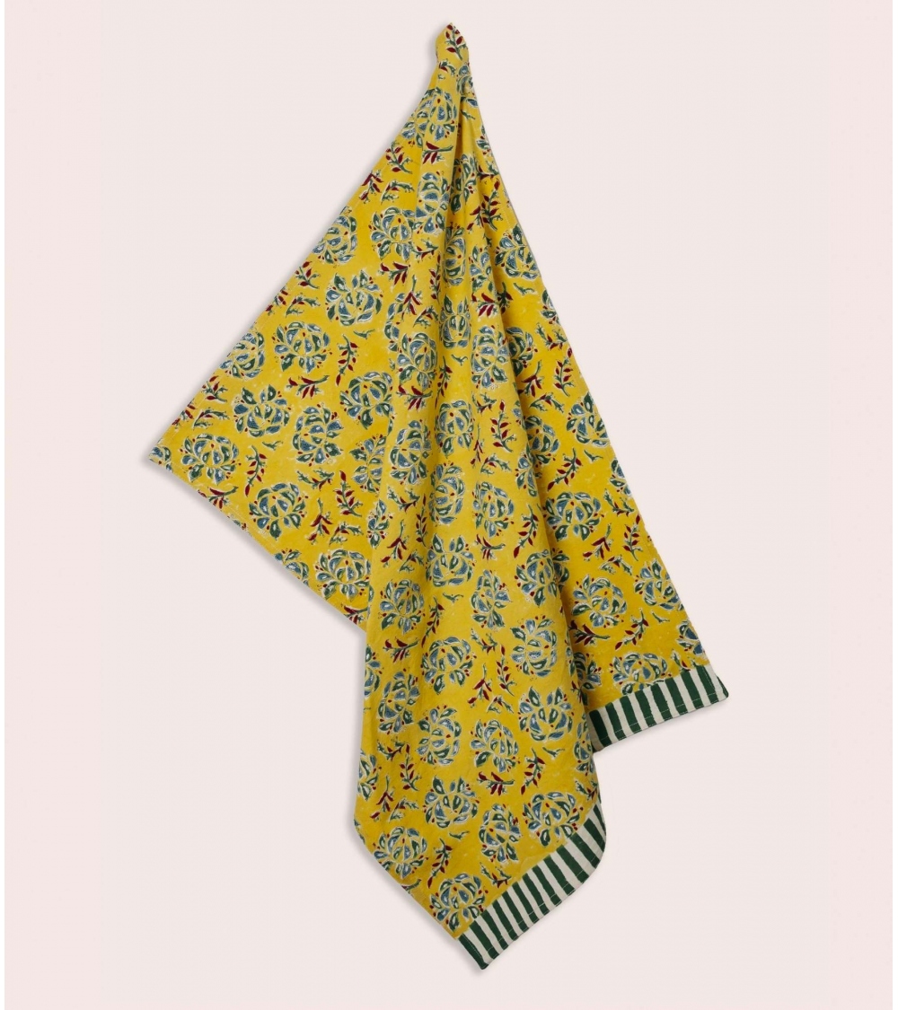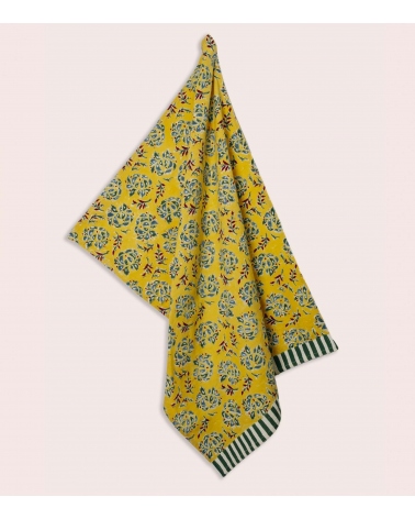 The Sarso kitchen towel is made from 100% cotton, block-printed by hand in Rajasthan. Each motif is hand-stamped by skilled Indian artisans using hand-carved wooden blocks, a centuries-old craft that gives every piece its own character.