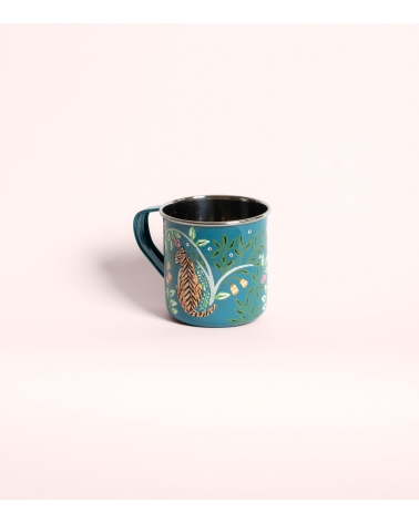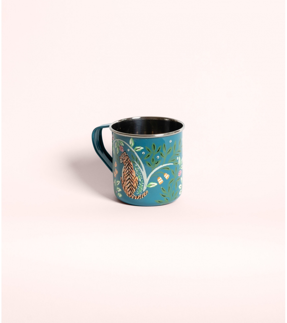 The Jamini mug is a piece of colorful Indian artisan tableware in stainless steel, hand-painted by master craftsmen from Kashmir. It unfolds a symphony of floral and animal motifs: lush arabesques, elephants, or Bengal tigers, resulting in a bohemian-decor and travel-inspired design.