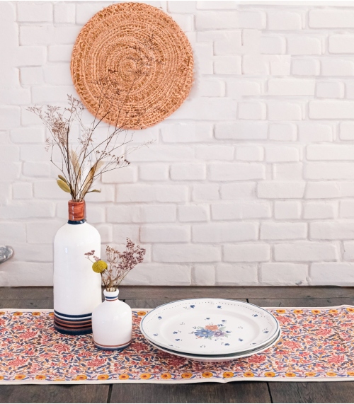 Fabriqués à partir de coton d’une grande qualité, nos chemins de tables sont imprimés à la main au « Block print » dans l’ouest de l’Inde. Cette technique consiste à imprimer les motifs à la force des poignets grâce aux tampons en bois sculptés à la main.
