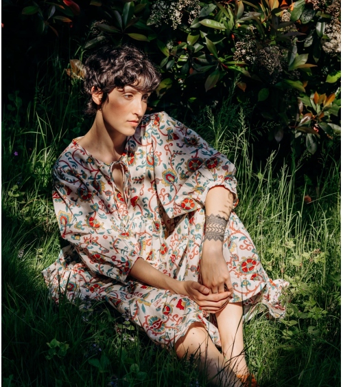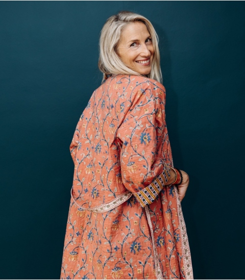 Nos différentes pièces de kimonos sont parées de nos plus beaux motifs imprimés à la main tel que Louise, Rang et Reema, leur richesse de coloris et de détails témoigne d’un travail artisanal et d’une expertise inégalés.