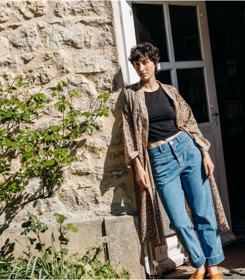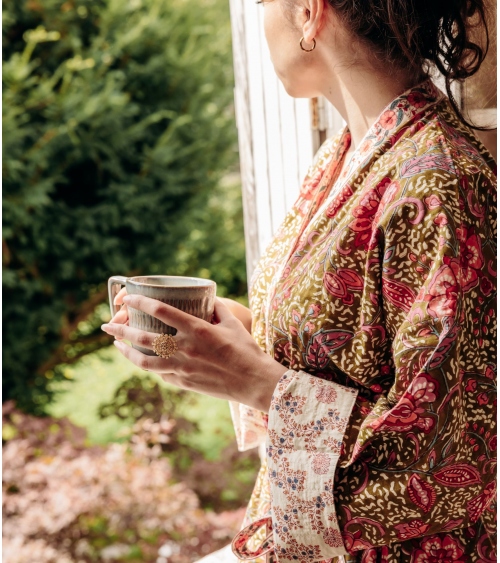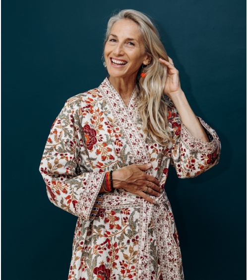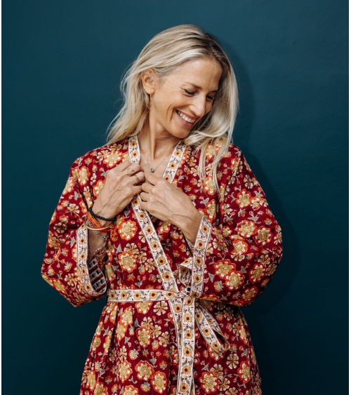 Les kimonos Jamini sont dessinés à Paris puis imprimés à la main au tampon de bois « Block print » dans nos ateliers Indiens, nous avons apporté à ce vêtement traditionnel notre vision et notre touche de modernité afin de proposer à nos clientes des pièces contemporaines et authentiques.