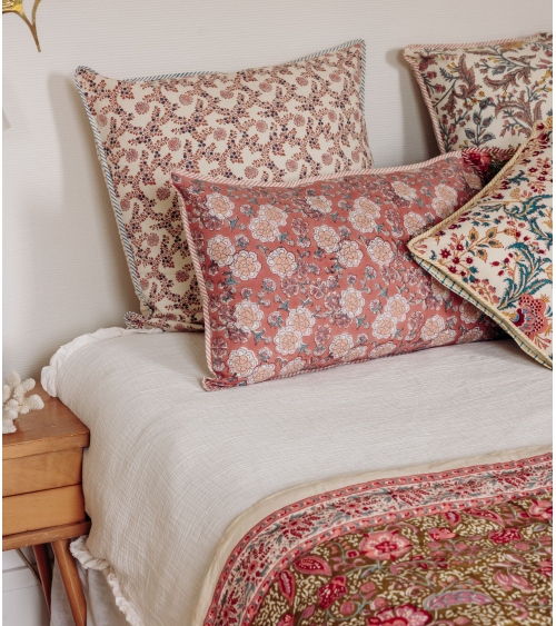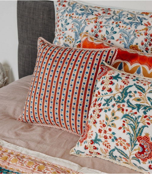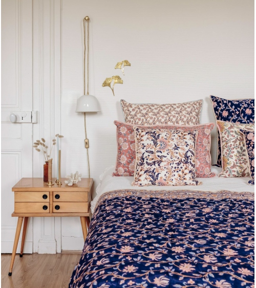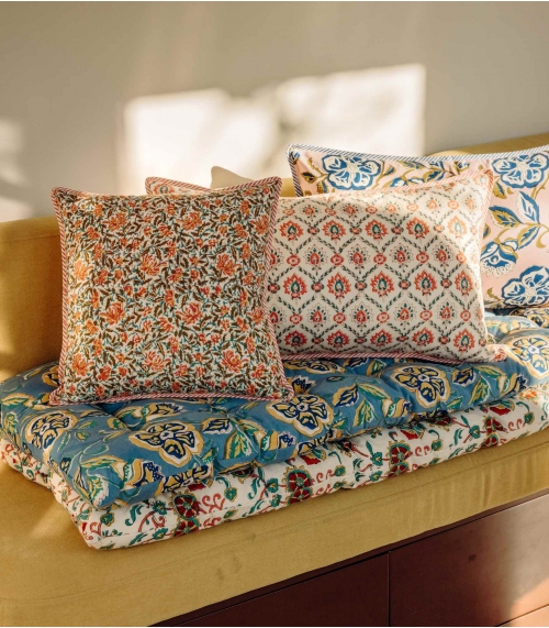 Nos housses de coussins sont imprimées de manière artisanale avec la technique du blockprint. Ce système d’impression au bloc de bois est un savoir-faire typique du Rajasthan dans l’Ouest de l’Inde. Vous avez la possibilité d’acheter la housse de coussin uniquement ou de commander l’intérieur de coussin. La composition 100% coton de nos coussins indiens vous assure un touché doux et soyeux qui confèrera à votre intérieur cette touche d’exotisme et d’évasion propre aux créations Jamini.
