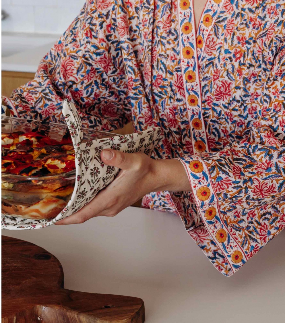 Fabriquée en Inde par des artisans experts selon la technique traditionnelle du blockprint, un savoir-faire ancestral du Rajasthan, cette pièce faite à la main contribue à préserver les savoir-faire traditionnels et à soutenir les communautés d’artisans