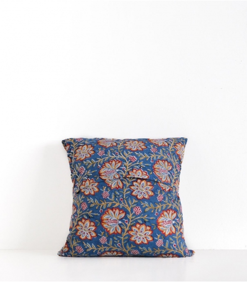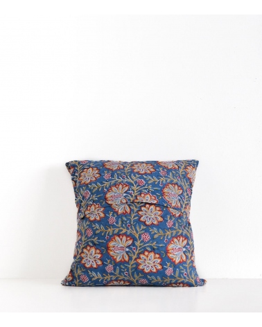 Cette housse de coussin carrée bleu nuit en coton imaginée à Paris mêle des tissus imprimés en Inde aux tampons de bois et des broderies lumineuses faites à la main en Afrique du Sud.
