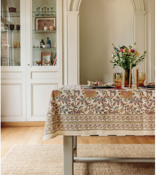 La nappe en coton BANNA est une pièce lumineuse et joyeuse pour embellir votre table avec son motif fleuri indien. Idéale pour créer une ambiance bohème et chic chez vous, cette nappe peut être assortie à nos sets et serviettes de table pour une harmonie parfaite.