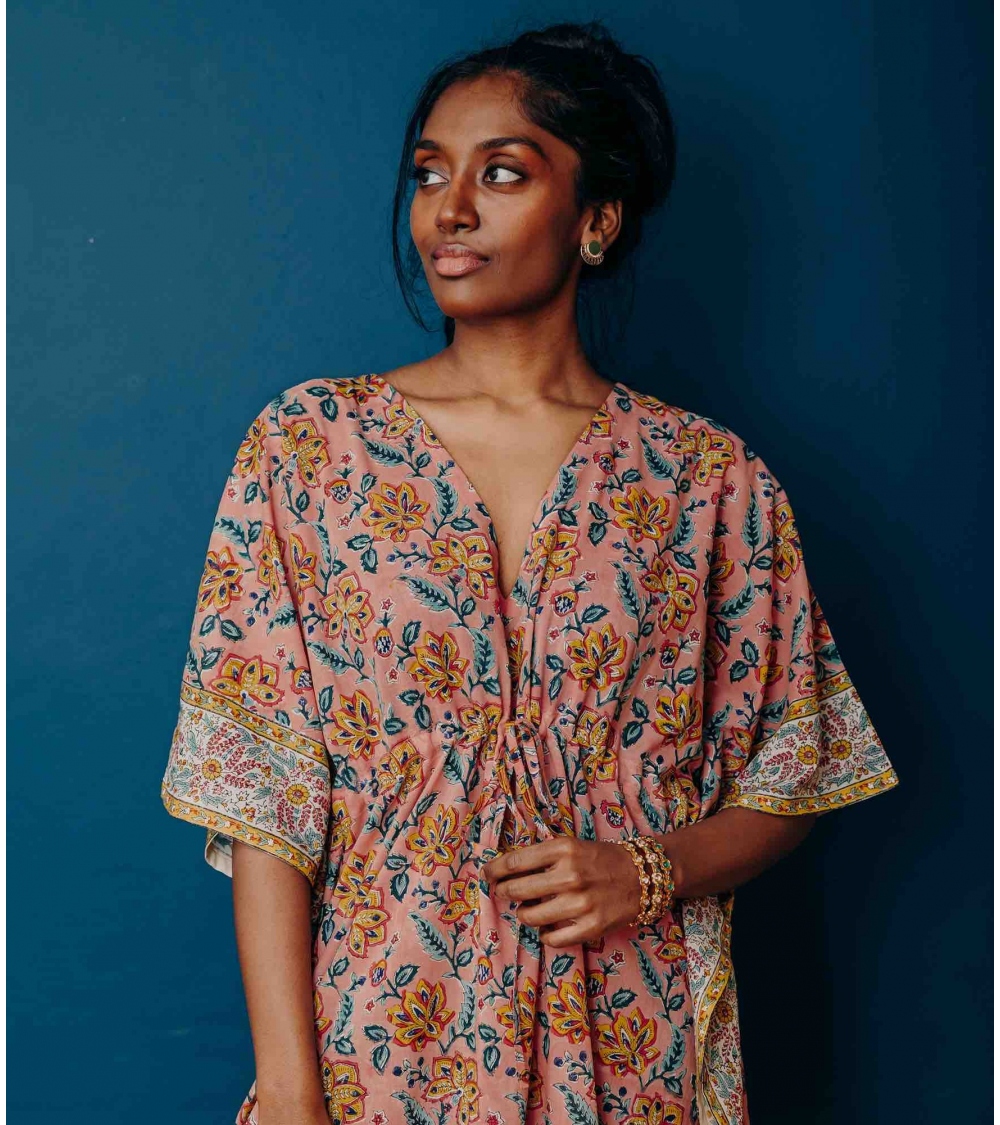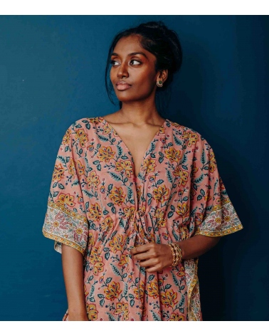 Le kaftan en coton RANG existe dans deux longueurs et se pare d'un motif fleuri bohème. Par-dessus un maillot, pour vos escapades estivales ou vos soirées, vous allez adorer sa coupe, sa douceur et sa couleur chatoyante !