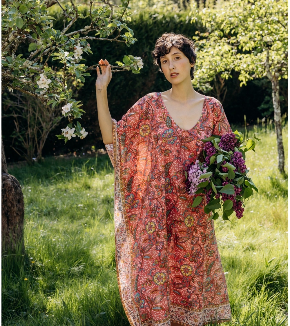 Fabriqué en Inde, ce kaftan est le fruit d’un savoir-faire ancestral. Réalisée à la main selon la technique traditionnelle du blockprint, propre au Rajasthan, chaque pièce est façonnée par des artisans passionnés. Ce processus artisanal contribue à préserver les traditions uniques du pays et soutient les communautés locales.