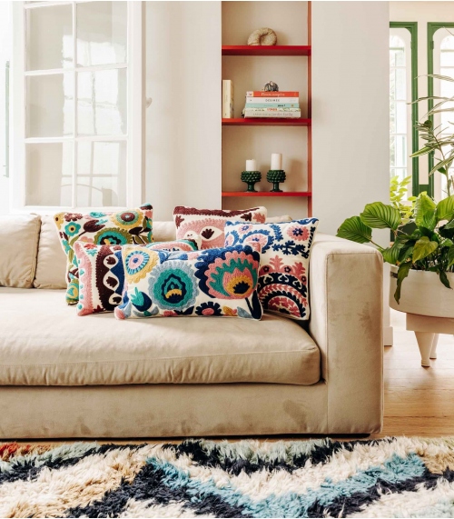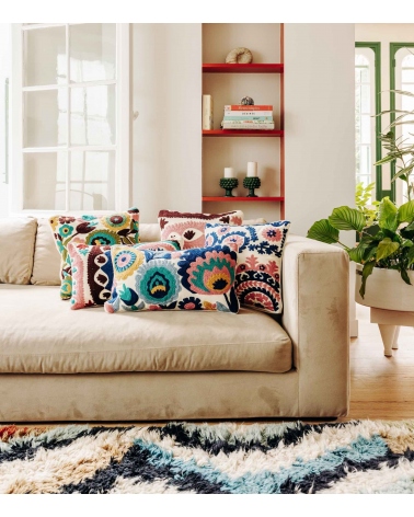 La housse de coussin en velours RUMI arbore des motifs bohèmes inspirés des tissus Suzani d'Asie centrale. Ses teintes chaudes et son toucher douillet la rendent parfaite pour une utilisation dans le salon ou dans la chambre à coucher. Mélangez les motifs et les couleurs pour créer un intérieur étonnant et élégant.