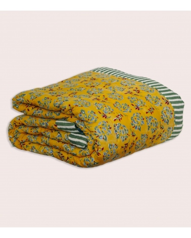 Le couvre-lit Sarso est en 100 % coton, imprimé au block print. Cette technique d'impression artisanale du Rajasthan repose sur l'utilisation de tampons en bois sculptés à la main. Chaque motif est appliqué manuellement par un artisan indien maîtrisant ce savoir-faire précis, garantissant l'authenticité et l'unicité de chaque pièce.