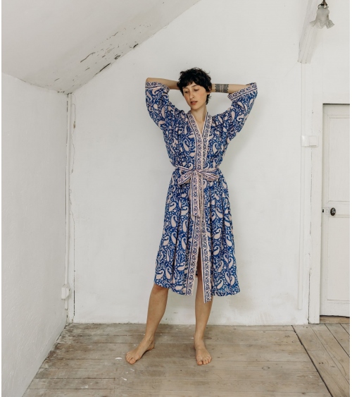 Fabriqué en Inde, ce kimono est le fruit d’un savoir-faire ancestral. Réalisée à la main selon la technique traditionnelle du blockprint, propre au Rajasthan, chaque pièce est façonnée par des artisans passionnés. Ce processus artisanal contribue à préserver les traditions uniques du pays et soutient les communautés locales.