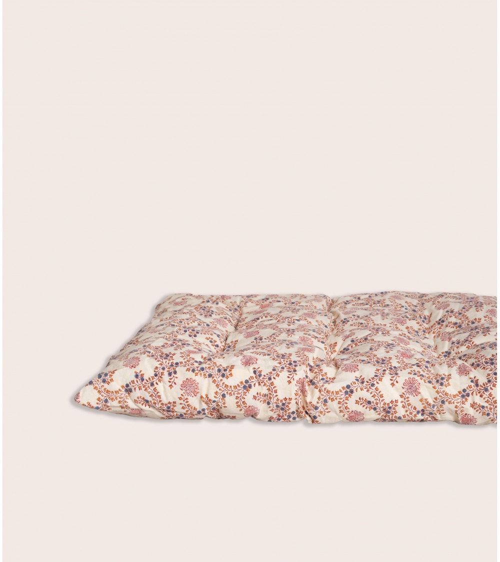 Il sera idéal sur un charpoy, un canapé ou tout simplement en matelas d'appoint. Il est garni de coton, ce qui permet un bon maintien de la forme et un confort d'assise.