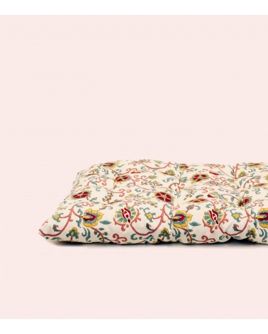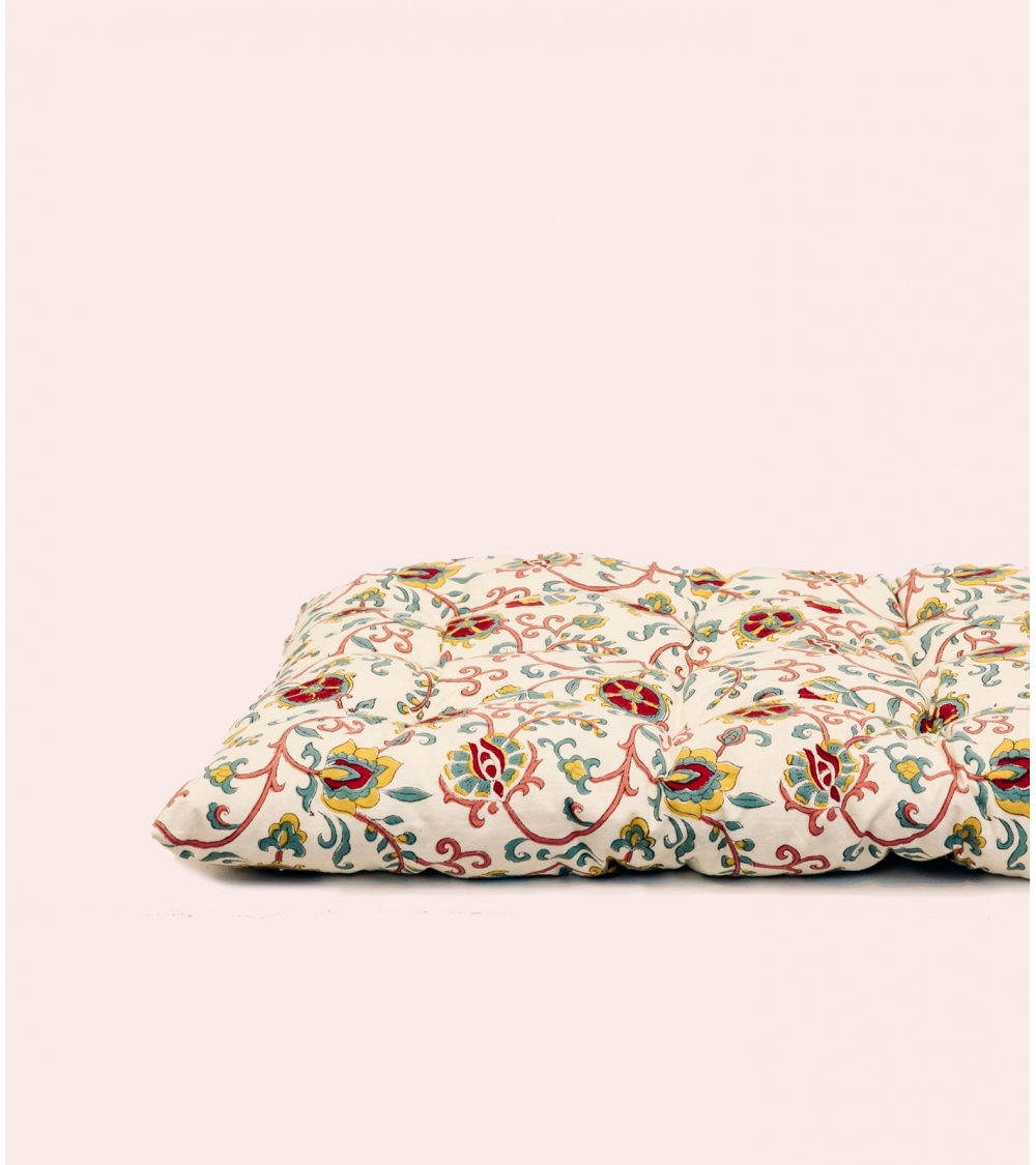 Fabriqué en Inde, ce matelas est le fruit d’un savoir-faire ancestral. Réalisé à la main selon la technique traditionnelle du blockprint, propre au Rajasthan, chaque pièce est façonnée par des artisans passionnés. Ce processus artisanal contribue à préserver les traditions uniques du pays et soutient les communautés locales.