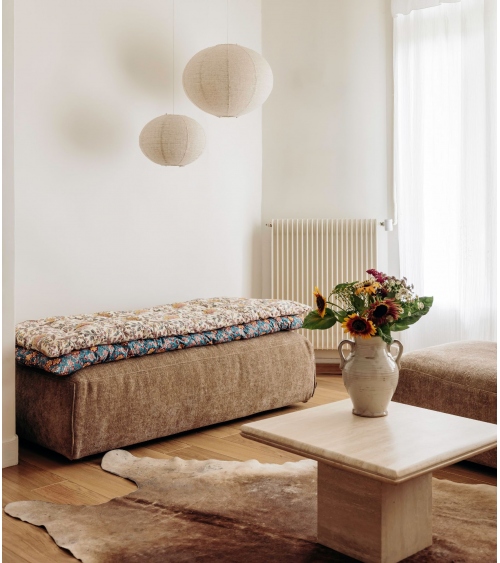 Chaque sofa cover est une création unique, marquée par des irrégularités naturelles et une texture singulière. L’impression artisanale, réalisée à la main, peut comporter de légères variations, reflet du soin minutieux et du savoir-faire transmis à chaque étape de sa fabrication.