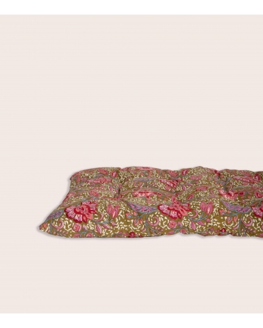 Fabriqué en Inde, ce matelas est le fruit d’un savoir-faire ancestral. Réalisé à la main selon la technique traditionnelle du blockprint, propre au Rajasthan, chaque pièce est façonnée par des artisans passionnés. Ce processus artisanal contribue à préserver les traditions uniques du pays et soutient les communautés locales.