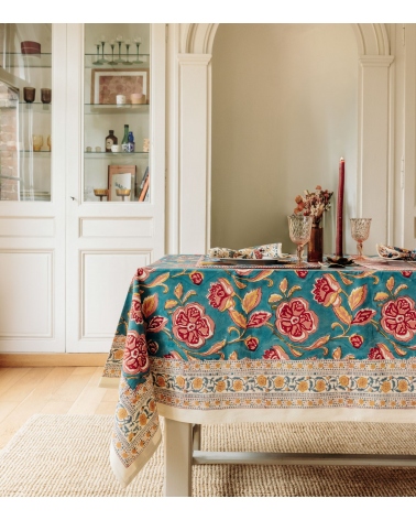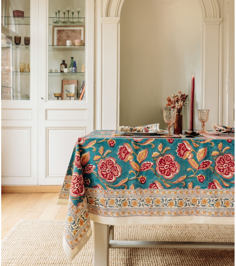 Fabriquée en Inde, cette nappe est le fruit d’un savoir-faire ancestral. Réalisée à la main selon la technique traditionnelle du blockprint, propre au Rajasthan, chaque pièce est façonnée par des artisans passionnés. Ce processus artisanal contribue à préserver les traditions uniques du pays et soutient les communautés locales.