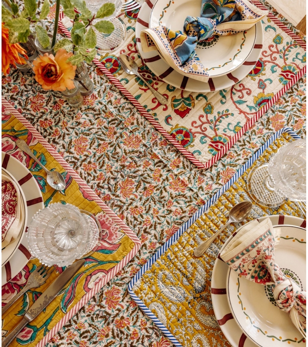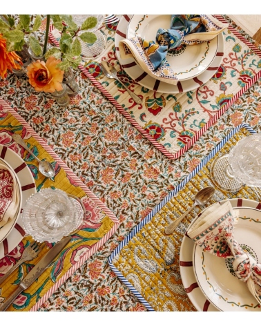 La nappe en coton REEMA est une pièce lumineuse et joyeuse pour embellir votre table avec son motif fleuri iconique. Idéale pour créer une ambiance bohème et colorée chez vous, cette nappe peut être assortie à nos sets et serviettes de table pour une harmonie parfaite.