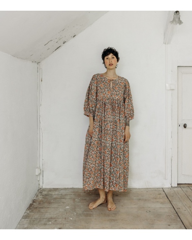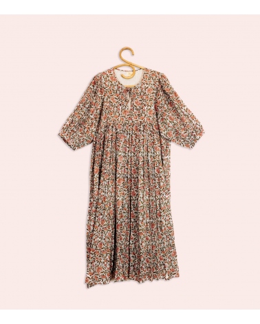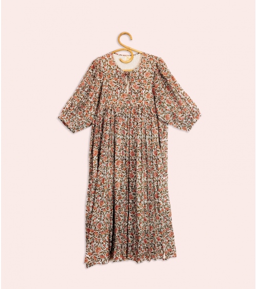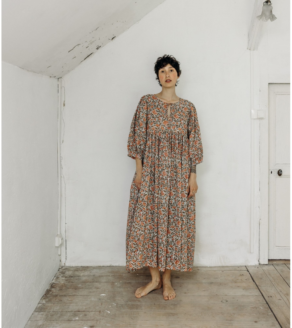 Fabriquée en Inde, cette robe est le fruit d’un savoir-faire ancestral. Réalisée à la main selon la technique traditionnelle du blockprint, propre au Rajasthan, chaque pièce est façonnée par des artisans passionnés. Ce processus artisanal contribue à préserver les traditions uniques du pays et soutient les communautés locales.