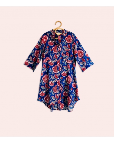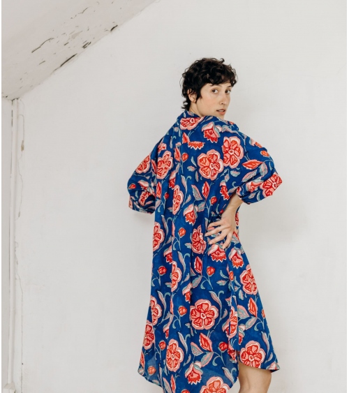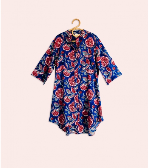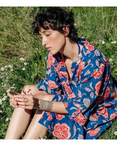 Fabriquée en Inde, cette robe chemise est le fruit d’un savoir-faire ancestral. Réalisée à la main selon la technique traditionnelle du blockprint, propre au Rajasthan, chaque pièce est façonnée par des artisans passionnés. Ce processus artisanal contribue à préserver les traditions uniques du pays et soutient les communautés locales.