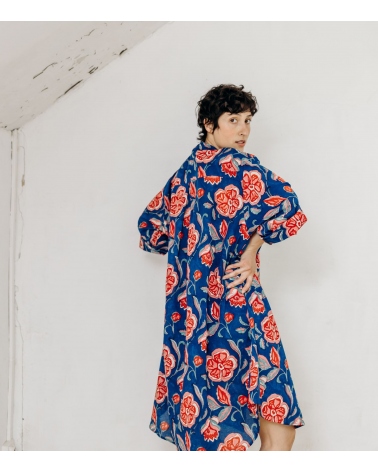 Chaque robe chemise est une création unique, marquée par des irrégularités naturelles et une texture singulière. L’impression artisanale, réalisée à la main, peut comporter de légères variations, reflet du soin minutieux et du savoir-faire transmis à chaque étape de sa fabrication.