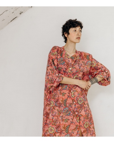 Chaque robe chemise est une création unique, marquée par des irrégularités naturelles et une texture singulière. L’impression artisanale, réalisée à la main, peut comporter de légères variations, reflet du soin minutieux et du savoir-faire transmis à chaque étape de sa fabrication.