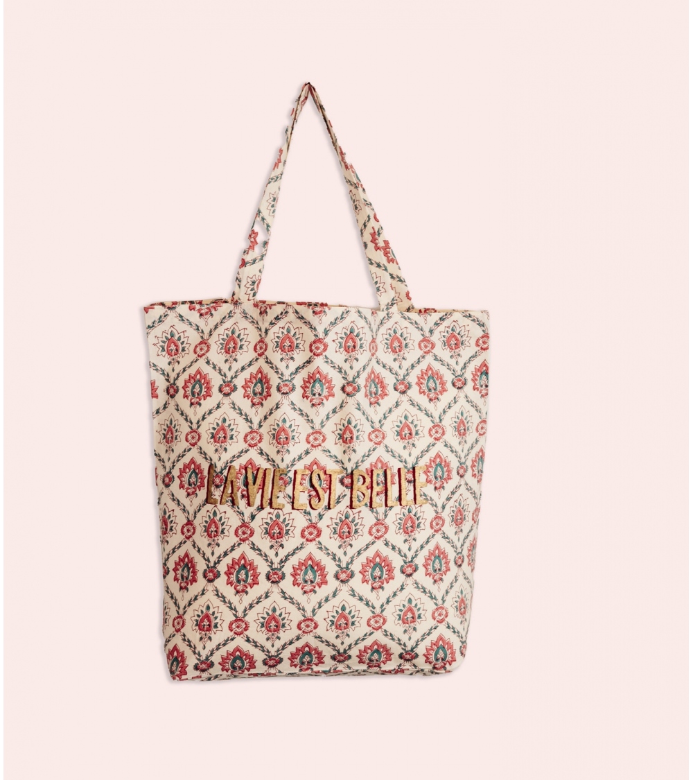 Conçu en Inde par des artisans experts utilisant la technique traditionnelle du blockprint, ce tote bag est réalisé à la main, préservant ainsi un savoir-faire ancestral du Rajasthan. Cette pièce unique soutient les communautés locales et contribue à la préservation des traditions artisanales.