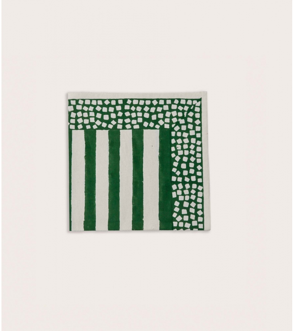 La serviette de table Lathi est en 100 % coton, imprimé au block print. Cette technique d'impression artisanale du Rajasthan repose sur l'utilisation de tampons en bois sculptés à la main. Chaque motif est appliqué manuellement par un artisan indien maîtrisant ce savoir-faire précis, garantissant l'authenticité et l'unicité de chaque pièce.