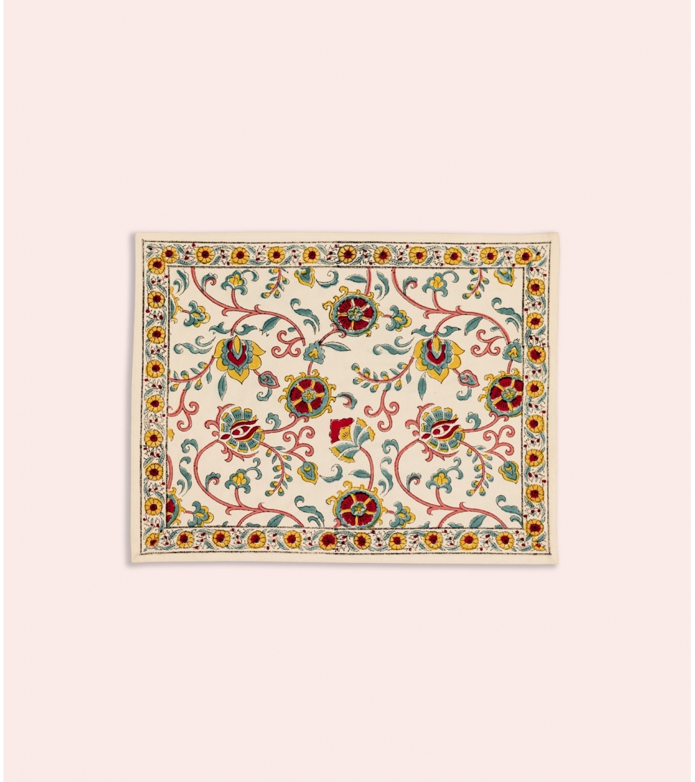 Fabriqué en Inde, ce set de table incarne l'excellence d’un savoir-faire ancestral. Réalisé selon la technique traditionnelle du blockprint, propre au Rajasthan, chaque pièce est confectionnée à la main par des artisans passionnés. Un geste précieux pour préserver des traditions artisanales uniques et soutenir les communautés locales.