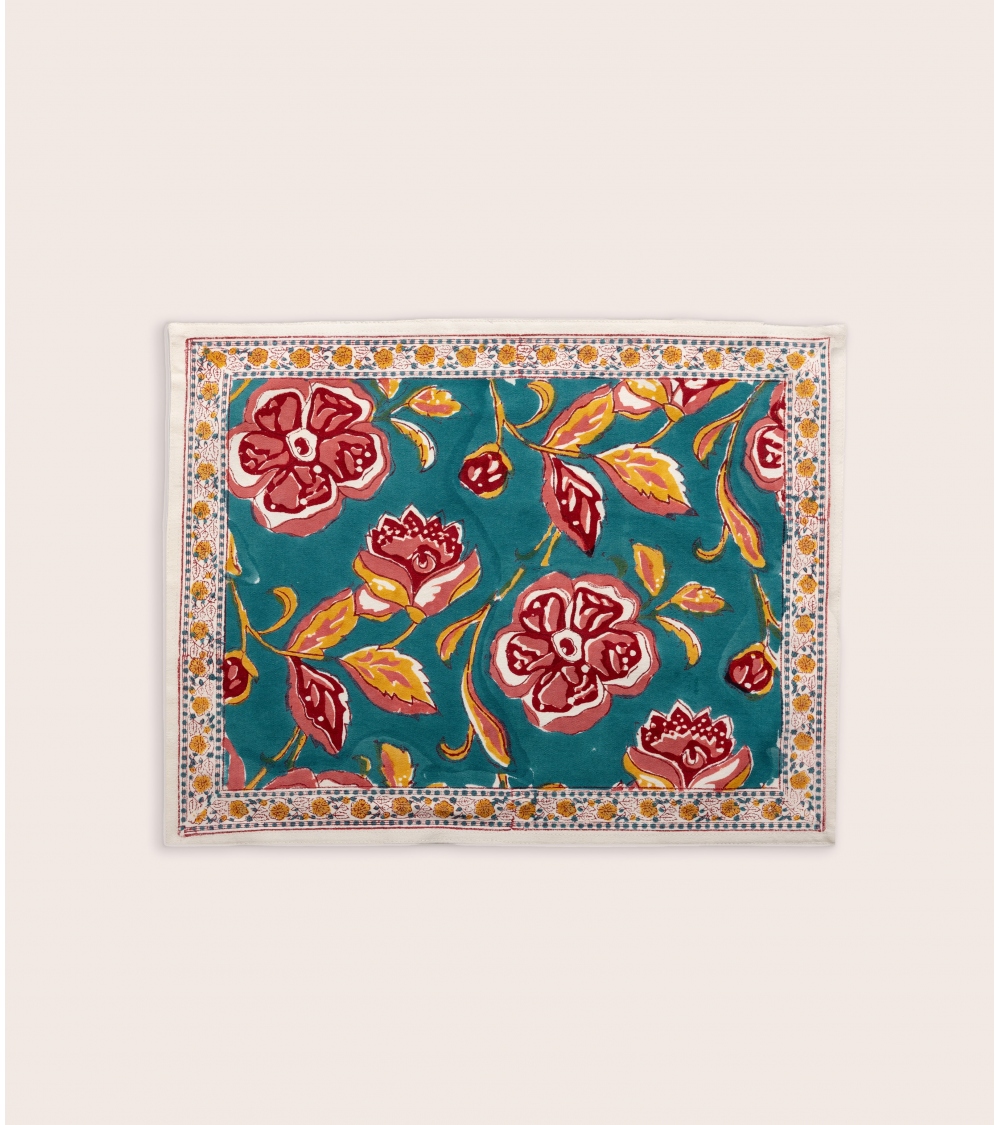 Fabriqué en Inde, ce set de table incarne l'excellence d’un savoir-faire ancestral. Réalisé selon la technique traditionnelle du blockprint, propre au Rajasthan, chaque pièce est confectionnée à la main par des artisans passionnés. Un geste précieux pour préserver des traditions artisanales uniques et soutenir les communautés locales.