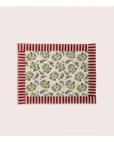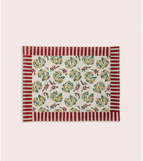 Le set de table Sarso est en 100 % coton, imprimé au block print. Cette technique d'impression artisanale du Rajasthan repose sur l'utilisation de tampons en bois sculptés à la main. Chaque motif est appliqué manuellement par un artisan indien maîtrisant ce savoir-faire précis, garantissant l'authenticité et l'unicité de chaque pièce.
